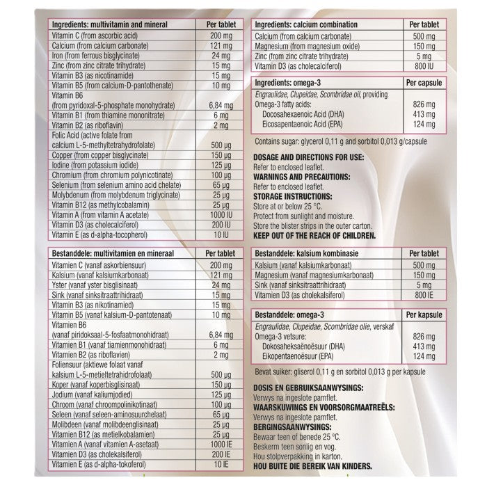 Take 1 calcium tablet as well as 1 multivitamin and mineral tablet and 1 omega-3 tablet daily with a meal.