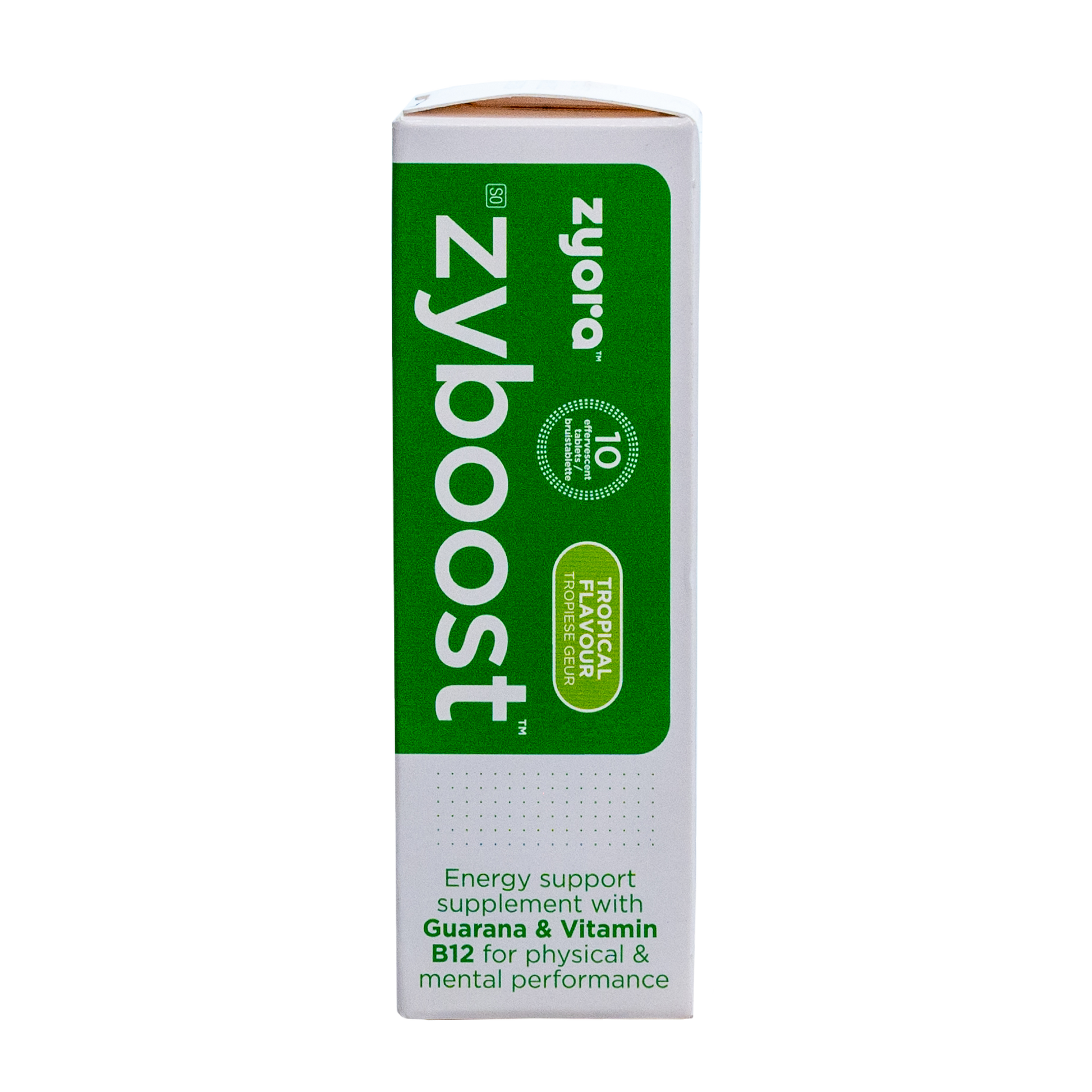 - Enhances physical & mental energy and reduces fatigue Zyboost contains a high dose of 7 B-vitamins, magnesium, guarana and MecobalActive Vitamin B12 to reduce physical and mental fatigue, whilst boosting energy levels all day long.