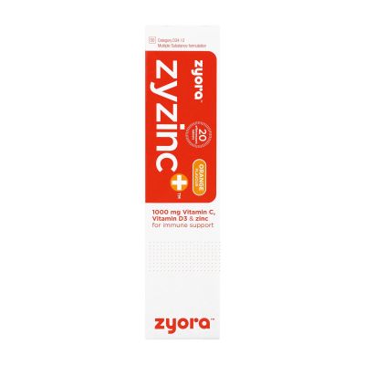 - Zyzinc+ is packed in 20 Effervescent Tablets and contains Vitamin C 1000mg, Vitamin D3 1000 IU and 10mg zinc per daily dose (1 Effervescent Tablet) . Zyzinc+ is sugar free, lactose free, vegetarian and suitable for diabetics.